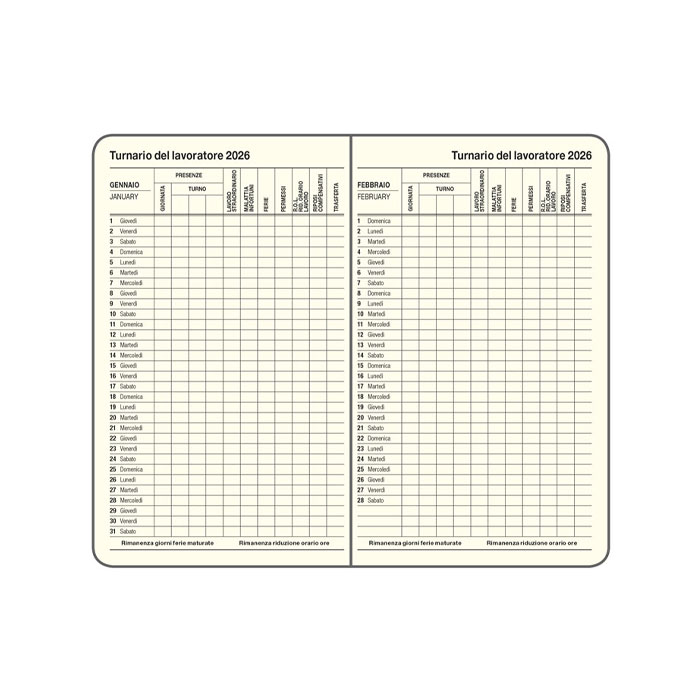 Include un turnario del lavoratore di 12 pagine, 3 pagine dedicate alle note, e 4 pagine con perforatura verticale removibile per appuntamenti o promemoria da strappare, inserti informativi. La stampa interna datario 1 colore su carta avorio dona un aspetto sobrio e professionale.