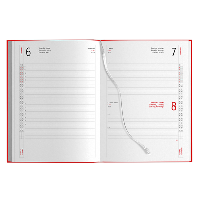 Stampata su carta bianca con stampa interna datario 2 colori (festività in rosso), è strutturata con layout sabato e domenica abbinati è disponibile in edizione multilingue: Italiano, Inglese, Francese, Tedesco, Spagnolo, Portoghese.