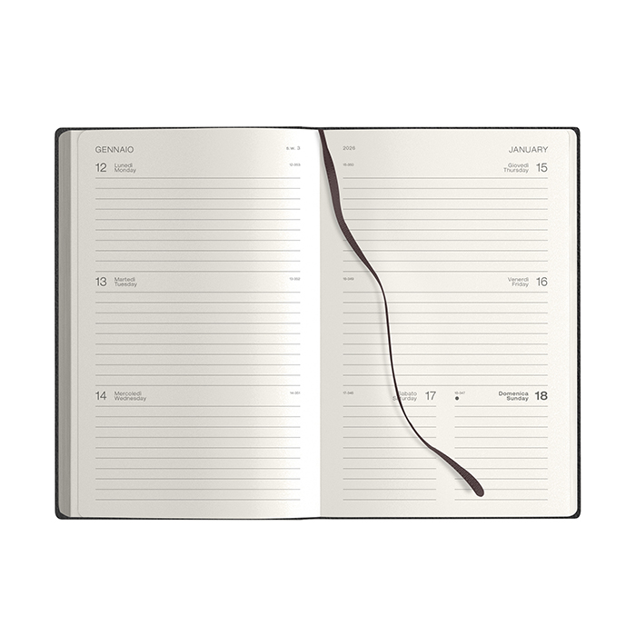 L’agenda è personalizzabile con il logo aziendale e disponibile in vari colori e finiture, perfetta per welcome kit, fiere, eventi aziendali e regali corporate.