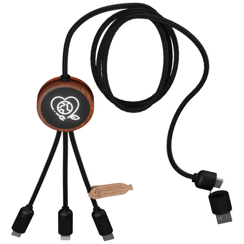 Cavo di ricarica 5 in 1 in PET riciclato con logo luminoso e custodia rotonda in bambù. Il logo...