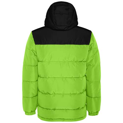 Giacca imbottita con cappuccio fisso. Cerniera anteriore coperta da una pattina. Proteggi mento....