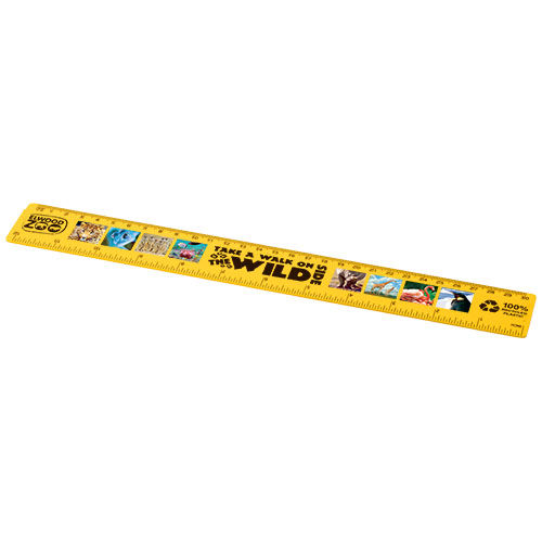 Resistente righello in plastica riciclata disponibile con marcature in pollici e in centimetri.