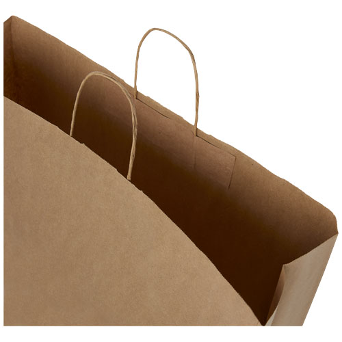 Sacchetto in carta kraft XXL (49 x 14 x 44 cm) con manici intrecciati, ampio e resistente. Realizzato in Europa con carta di provenienza responsabile (bianco 100 g/m², marrone 90 g/m²), è una scelta ecologica e durevole perfetta per trasportare articoli voluminosi. Grazie al suo design naturale e rustico, aggiunge un tocco elegante in qualsiasi occasione, dal confezionamento di regali allo shopping quotidiano o agli eventi promozionali. Un’alternativa pratica e sostenibile alle borse di plastica monouso, completamente riciclabile e personalizzabile.