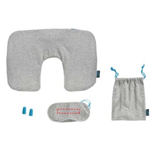 Morbido set da viaggio contenente un cuscino gonfiabile per il collo con cerniera azzurra, una...