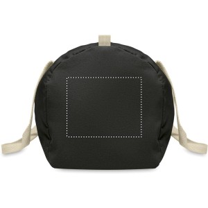 Zaino con parti colorate in 600D poliestere, cordino sulla parte frontale e tasche a rete sui lati.
