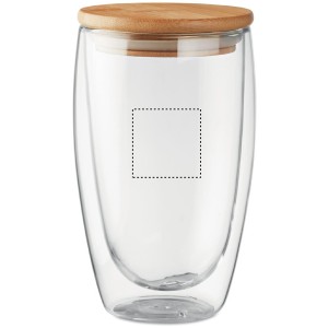 Bicchiere in doppio vetro borosilicato con tappo in bamboo con anello in silicone. Capacità 450ml.